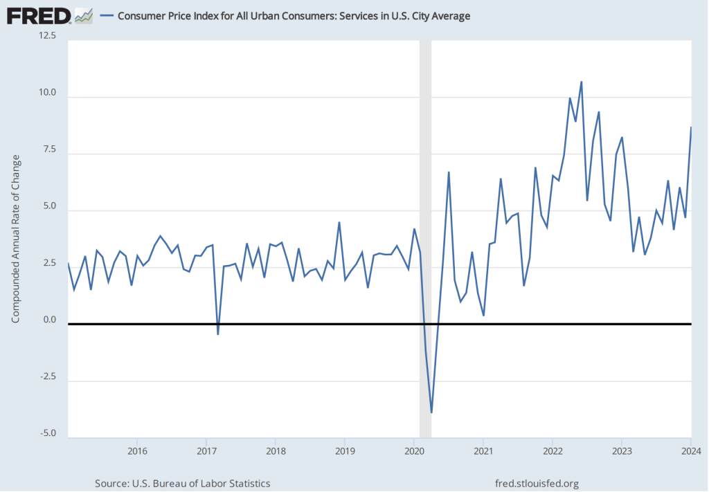 The following figure shows the 1-month inflation rate in services prices. The figure shows that inflation in services has been above 4 percent in every month since July 2023. Inflation in services was a very high 8.7 percent in January. Clearly such large increases in the prices of services aren’t consistent with the Fed meeting its 2 percent inflation target.