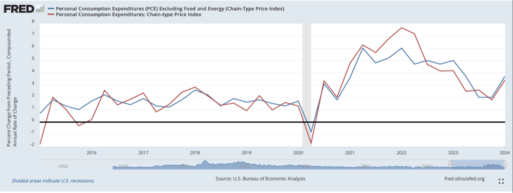 The second striking point in the report was an unexpected increase in inflation, as measured using the personal consumption expenditures (PCE) price index. As the following figure shows, PCE inflation (the red line), measured as a compound annual rate of change, increased from 1.8 percent in the fourth quarter of 2023 to 3.4 percent in the first quarter of 2024. Core PCE inflation (the blue line), which excludes food and energy prices, increased from 2.0 percent in the fourth quarter of 2023 to 3.7 percent in the first quarter of 2024. These data indicate that inflation in the first quarter of 2024 was running well above the Federal Reserve’s 2.0 percent target.