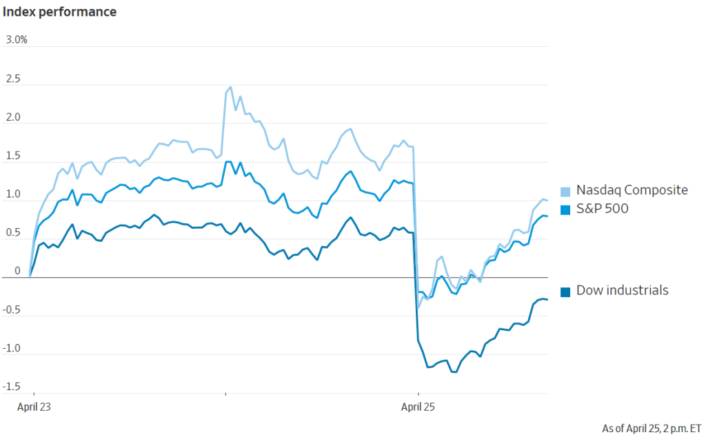 Looking at these details of the GDP report indicate that growth may have slowed less during the first quarter than the growth rate of real GDP seems to indicate. Investors on Wall Street may have come to this same conclusion. As shown by this figure from the Wall Street Journal, shows that stock prices fell sharply when trading opened at 9:30 am, but by 2 pm has recovered some of their losses as investors considered further the implications of the GDP report. (As we discuss in Macroeconomics, Chapter 6, Section 6.2 and Economics, Chapter 8, Section 8.2, movements in stock price indexes can provide some insight into investors’ expectations of future movements in corporate profits, which, in turn, depend in part on future movements in economic growth.)