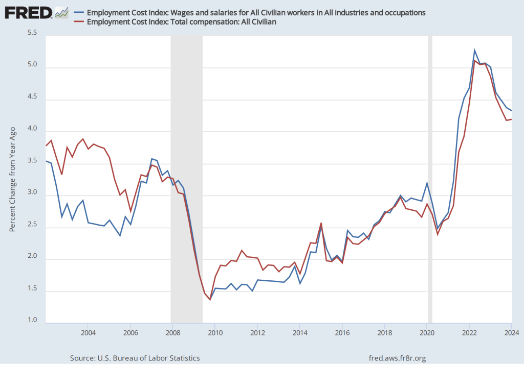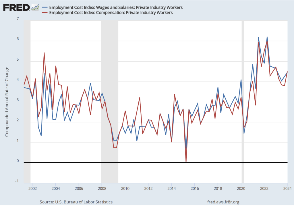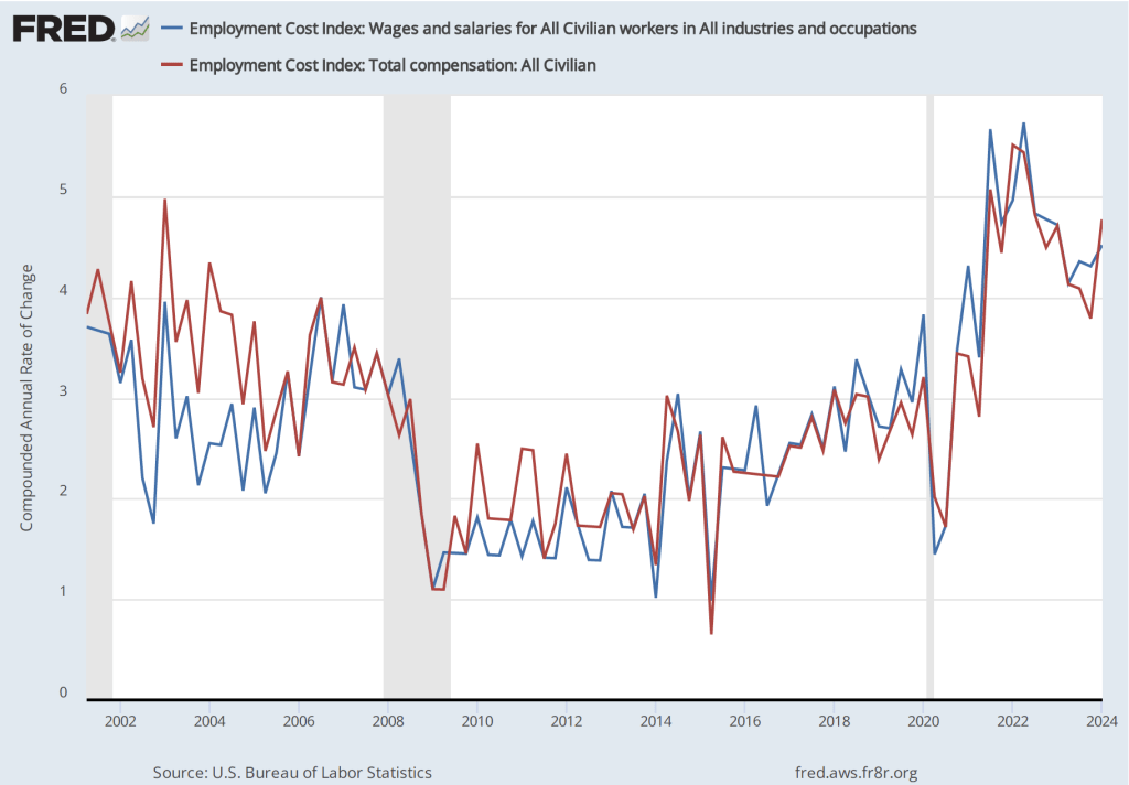 If we look at the compound annual growth rate of the ECI—the annual rate of increase assuming that the rate of growth in the quarter continued for an entire year—we find that the rate of increase in wages and salaries increased from 4.3 percent in the fourth quarter of 2023 to 4.5 percent in the first quarter of 2024. Similarly, the rate of increase in compensation increased from 3.8 percent in the third quarter of 2023 to 4.5 percent in the first quarter of 2024.