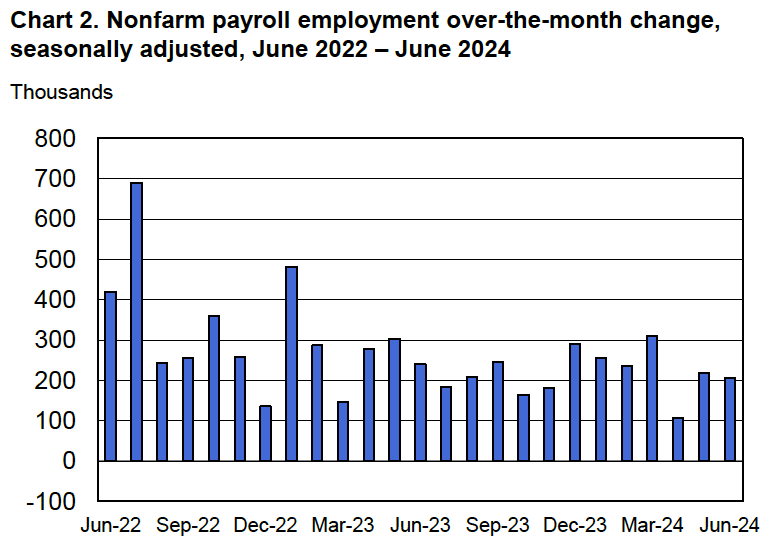 This morning (July 5), the Bureau of Labor Statistics (BLS) released its “Employment Situation” report (often referred to as the “jobs report”) for June, which, while seemingly indicating continued strong job growth, also provides some indications that the labor market may be weakening. The jobs report has two estimates of the change in employment during the month: one estimate from the establishment survey, often referred to as the payroll survey, and one from the household survey. As we discuss in Macroeconomics, Chapter 9, Section 9.1 (Economics, Chapter 19, Section 19.1), many economists and policymakers at the Federal Reserve believe that employment data from the establishment survey provides a more accurate indicator of the state of the labor market than do either the employment data or the unemployment data from the household survey. (The groups included in the employment estimates from the two surveys are somewhat different, as we discuss in this post.)