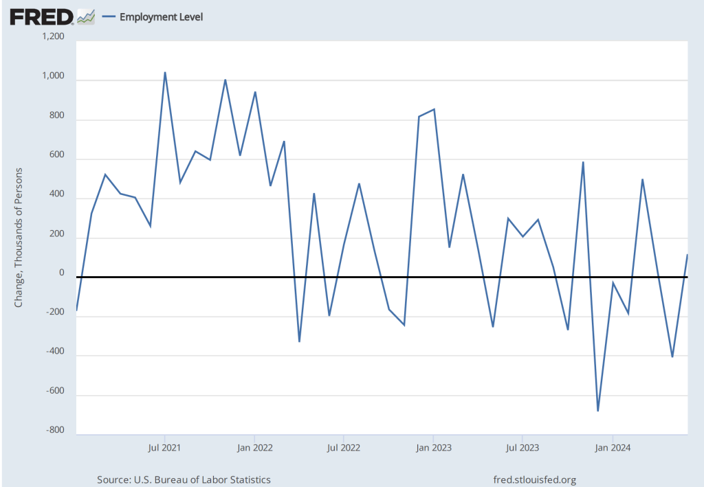 As the following figure shows, the net change in jobs from the household survey moves much more erratically than does the net change in jobs in the establishment survey. The net increase in jobs as measured by the household survey increased from –408,000 in May (that is, employment by this measure fell during May) to 116,000 in June.