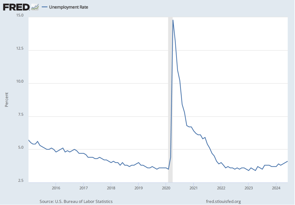 The unemployment rate, which is also reported in the household survey, ticked up slightly from 4.0 percent to 4.1 percent. Although still low by historical standards, June was the fourth consecutive month in which the unemployment rate increased.