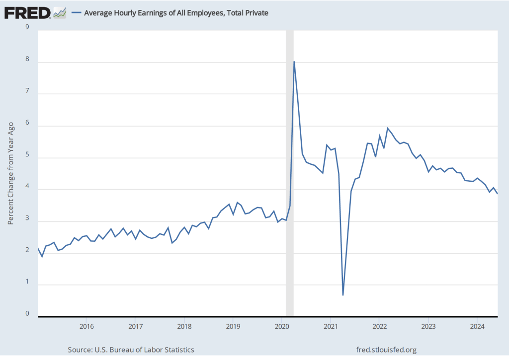 The establishment survey also includes data on average hourly earnings (AHE). As we note in this post, many economists and policymakers believe the employment cost index (ECI) is a better measure of wage pressures in the economy than is the AHE. The AHE does have the important advantage that it is available monthly, whereas the ECI is only available quarterly. The following figure show the percentage change in the AHE from the same month in the previous year. The 3.9 percent increase for June continues a downward trend that began in January and is the smallest increase since June 2021.