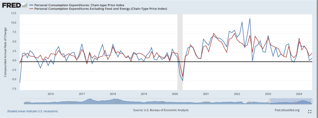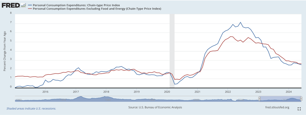 On July 26, the Bureau of Economic Analysis (BEA) released its “Personal Income and Outlays” report for June. The report includes monthly data on the personal consumption expenditures (PCE) price index. The Fed relies on annual changes in the PCE price index to evaluate whether it’s meeting its 2 percent annual inflation target. The report confirmed that PCE inflation slowed in the second quarter, bringing it closer to the Fed’s 2 percent target.