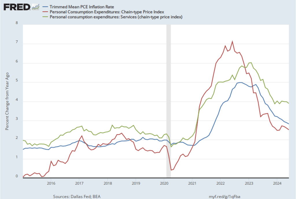 Inflation using the trimmed mean measure was 2.8 percent in June (calculated as a 12-month inflation rate), down only slightly from 2.9 percent in May—and still above the Fed’s target inflation rate of 2 percent. Inflation in services remained high in June at 3.9 percent, down only slightly from 4.0 percent in May.