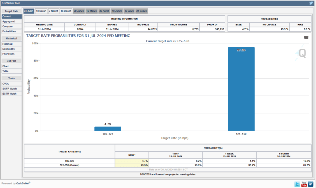 The probabilities in the chart reflect investors’ predictions of what the FOMC’s target for the federal funds rate will be after the committee’s July meeting. The chart indicates that investors assign a probability of only 4.7 percent to the FOMC cutting its federal funds rate target by 0.25 percentage point at its July 30-31 meeting and an 95.3 percent probability of the commitee leaving the target unchanged.