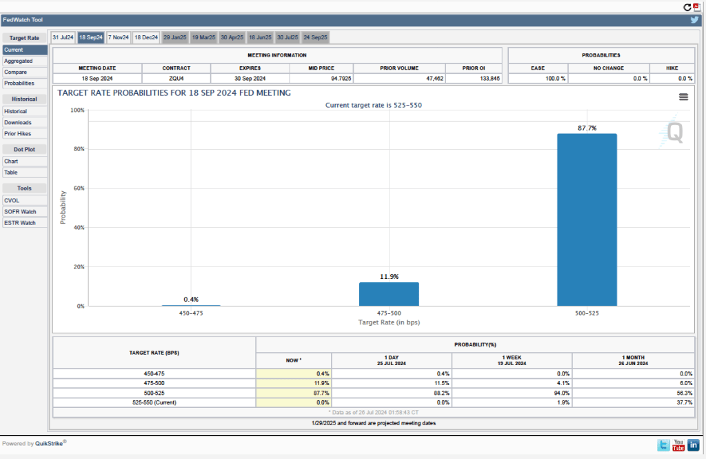 This month’s PCE inflation data indicate that the inflation rate is still declining towards the Fed’s target, with the low 1-month inflation rates being particularly encouraging. It now seems likely that the FOMC will soon lower the committee’s target for the federal funds rate, which is currently 5.25 percent to 5.50 percent. Remarks by Fed Chair Powell have been interpreted as hinting as much. The next meeting of the FOMC is July 30-31. What do financial markets think the FOMC will decide at that meeting?