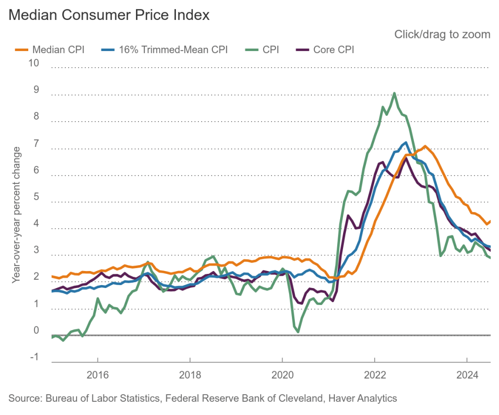 As the following figure (from the Federal Reserve Bank of Cleveland) shows, median inflation (the brown line) ticked up slightly from 4.2 percent in June to 4.3 percent in July. Trimmed mean inflation (the blue line) was unchanged in July at 3.3 percent. One conclusion from these data is that headline and core inflation may be somewhat understating the underlying rate of inflation.