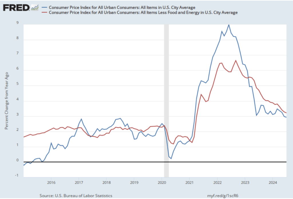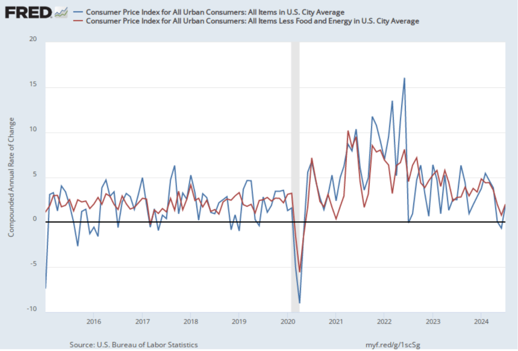 As the following figure shows, if we look at the 1-month inflation rate for headline and core inflation—that is the annual inflation rate calculated by compounding the current month’s rate over an entire year—we see an increase in the inflation rate in July, but the increase is from the very low levels in June. Headline inflation (the blue line) increased from –0.7 percent in June (which means that consumer price actually fell that month) to 1.9 percent in July. Core inflation (the red line) increased from 0.8 percent in June to 2.o percent in July. Overall, we can say that, taking 1-month and 12 month inflation together, the U.S. economy seems on course for a soft landing—with the annual inflation rate returning to the Fed’s 2 percent target without the economy being pushed into a recession. (Note, though, that the Fed uses the personal consumption expenditures (PCE) price index, rather than the CPI in evaluating whether it is hitting its 2 percent inflation target.)