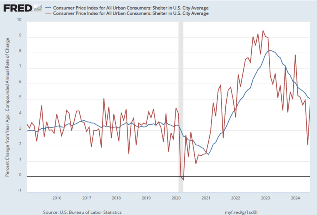 As the following figure shows, inflation in the price of shelter has been a significant contributor to headline inflation. The blue line shows 12-month inflation in shelter and the red line shows 1-month inflation in shelter. Twelve-month inflation in shelter continued its decline that began in the spring of 2023, falling from 5.1 percent in June to 5.0 percent July. One-month inflation in shelter—which is much more volatile than 12-month inflation in shelter—increased from 2.1 percent in June to 4.6 percent in July. The value for 1-month inflation in shelter may concern the members of the FOMC, but the continuing decline in in the less volatile 12-month inflation in shelter provides some reassurance that inflation in shelter is likely continuing to decline.