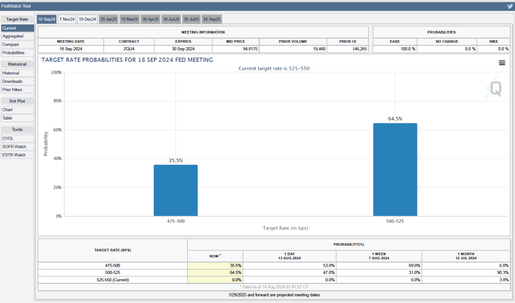 The probabilities in the chart reflect investors’ predictions of what the FOMC’s target for the federal funds rate will be after the committee’s September meeting. The chart indicates that investors assign a probability of 35.5 percent to the FOMC cutting its target range for the federal funds rate by 0.50 percentage point from the current 5.25 prcent to 5.50 percent to 4.75 percent to 5.25 percent. Investors assign a much larger probability—64.5 percent—to the FOMC cutting its target range for the federal funds rate by 0.25 percentage point to 5.00 percent to 5.25 percent.
