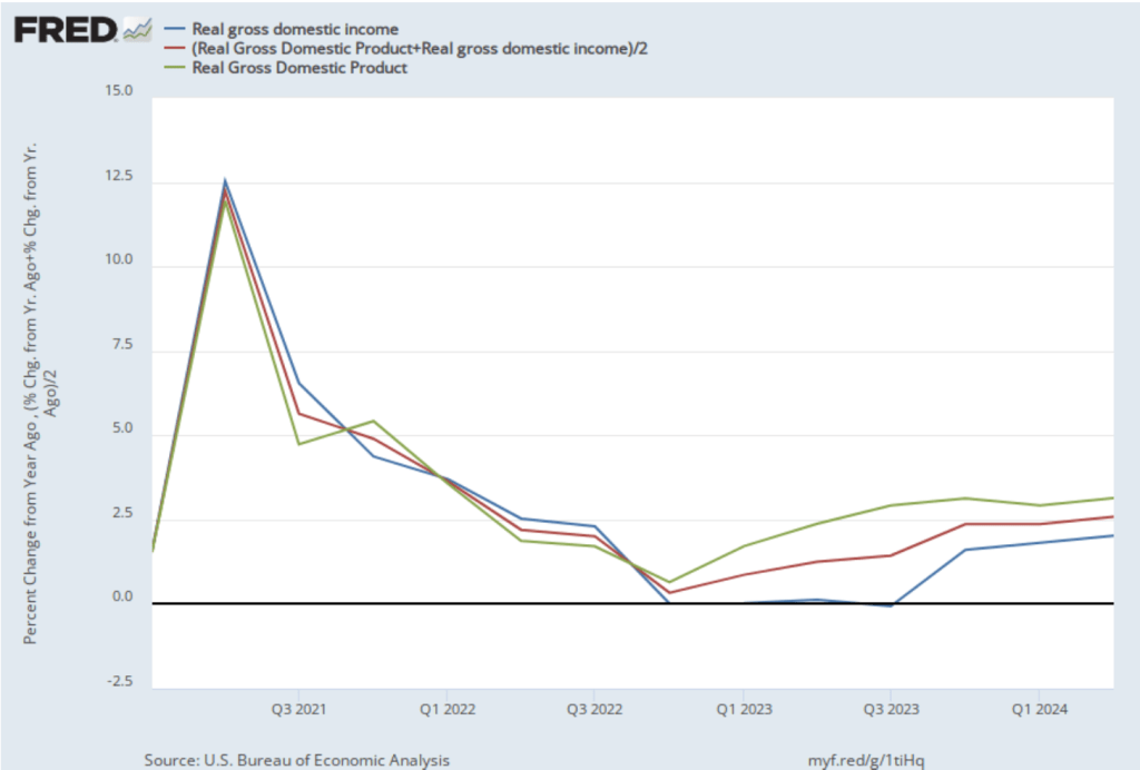 The figure above shows that in the past two years the growth rate of real GDP (the green line in the figure) has been significantly different—significantly higher—than the growth rate of GDI (the blue line). Both growth rates are measured as the percentage change from the same quarter in the previous year. Until the fourth quarter of 2022, the two growth rates were roughly similar over the period shown. But for the four quarters beginning in the fourth quarter of 2022, real GDI was flat with a growth rate of 0.0 percent, while real GDP grew at an average annual rate of 1.9 percent during that period. From the fourth quarter of 2023 through the second quarter of 2024, real GDI grew, but at an average annual rate of 1.8 percent, while real GDP was growing at a rate of 3.1 percent. (Some economists prefer to average the growth rates of GDP and GDI, which we show with the red line in the figure.)