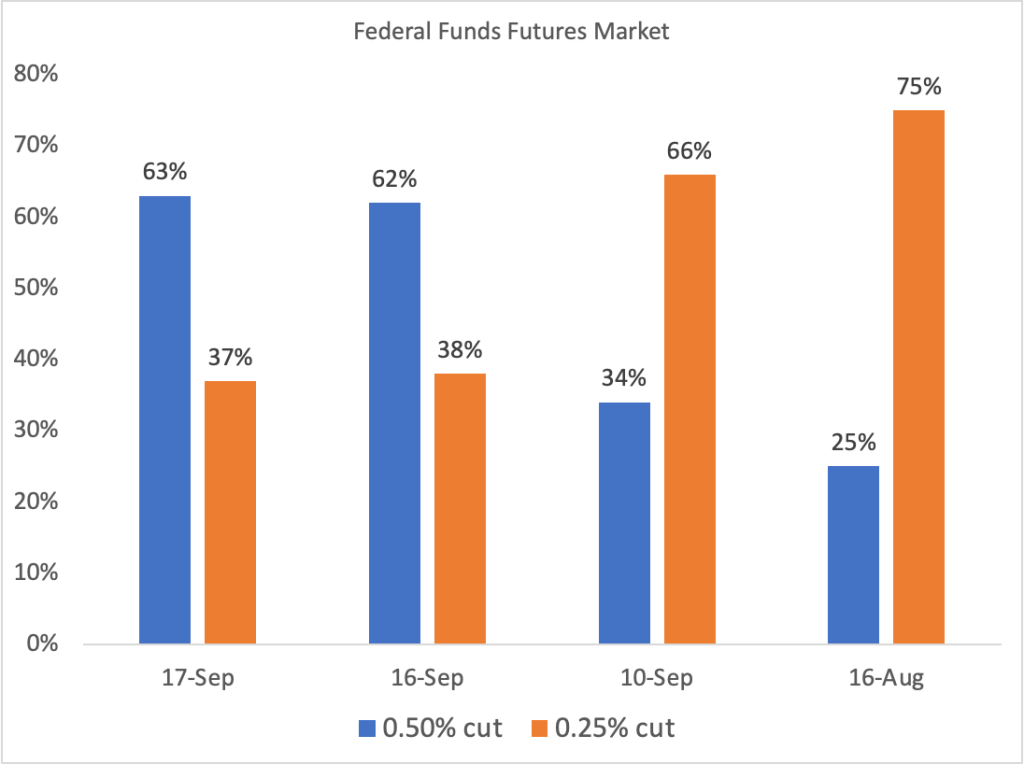 Tomorrow (September 18) at 2 p.m. EDT, the Federal Reserve’s policy-making Federal Open Market Committee (FOMC) will announce its target for the federal funds rate. It’s been clear since Fed Chair Jerome Powell’s speech on August 23 at the Kansas City Fed’s annual monetary policy symposium held in Jackson Hole, Wyoming that the FOMC would cut its target for the federal funds rate at its meeting on September 17-18. (We discuss Powell’s speech in this blog post.)