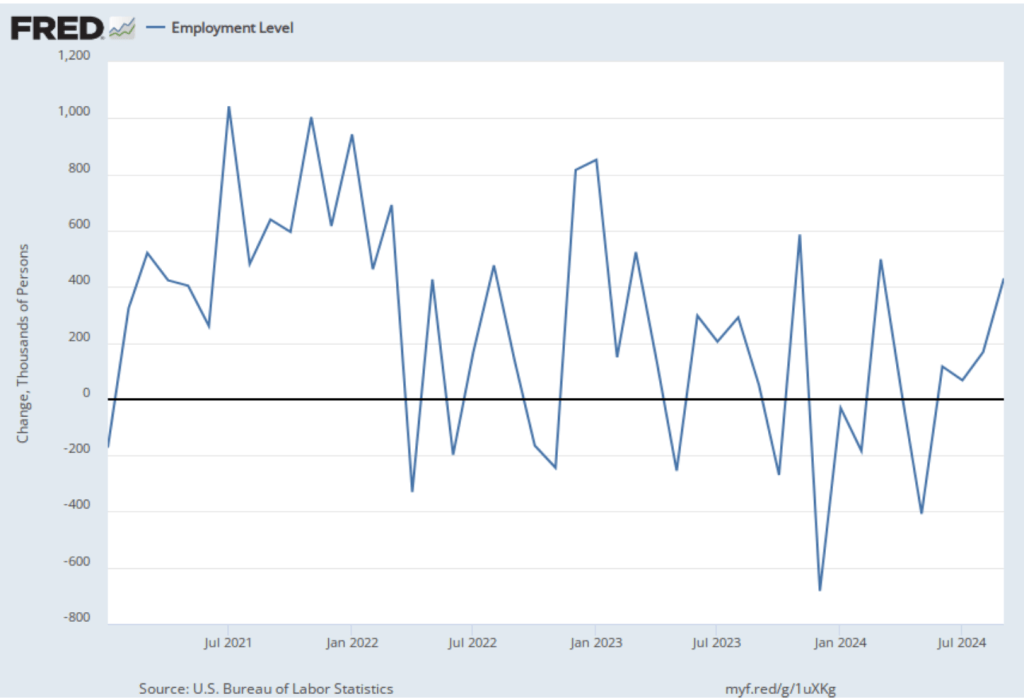 As the following figure shows, the net change in jobs from the household survey moves much more erratically than does the net change in jobs from the establishment survey. The net change in jobs as measured by the household survey increased from 168,000 in August to 430,000 in September. So, in this case the direction of change in the two surveys was the same, with both showing strong increases in the net number of jobs created in September.