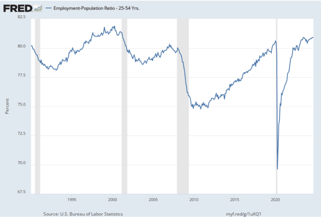 The household survey also provides data on the employment-population ratio. The following figure shows the employment-population ratio for prime age workers—those aged 25 to 54. It’s been unchanged since July at 80.9 percent, the higest level since 2001.