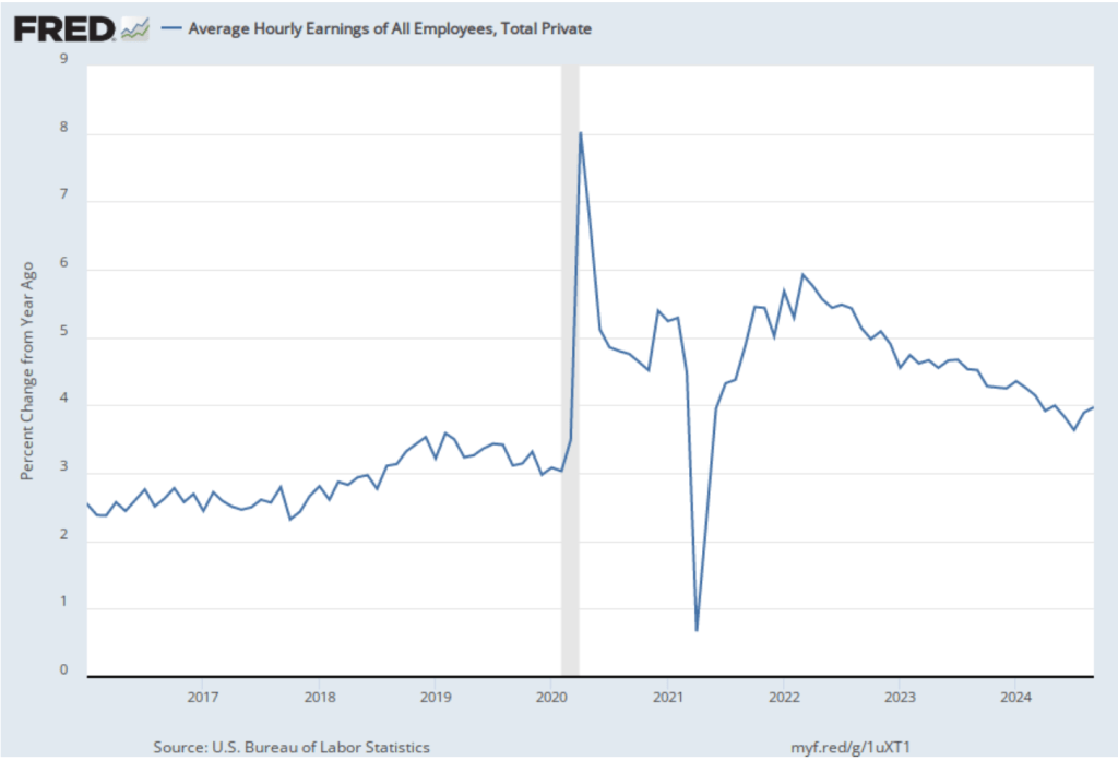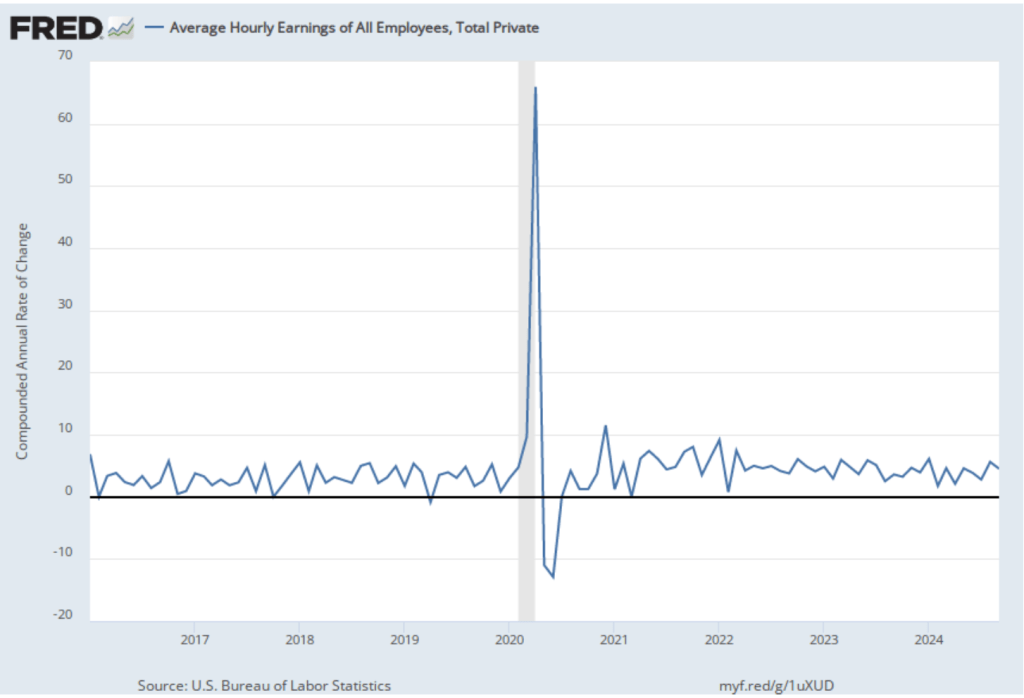 The 1-month rate of wage inflation of 4.5 percent in September is a decrease from the 5.6 percent rate in August. Whether measured as a 12-month increase or as a 1-month increase, AHE is increasing more rapidly than is consistent with the Fed achieving its 2 percent target rate of price inflation.