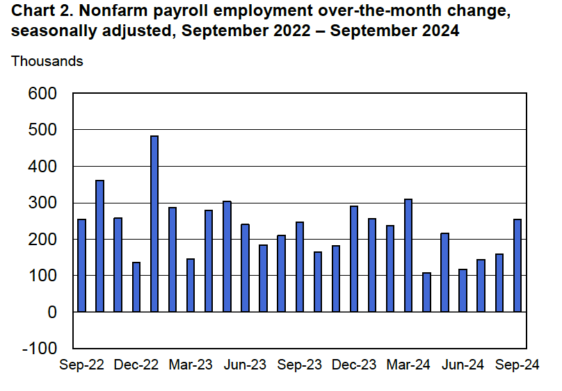 Economists surveyed by the Wall Street Journal and by Bloomberg had forecast a net increase in payroll employment of 150,000 and an unchanged unemployment rate of 4.2 percent. The BLS reported a higher net increase of 250,000 jobs and a tick down of the unemployment rate to 4.1 percent. In addition, the BLS revised upward its estimates of the employment increases in July and August by a total of 72,000. (The BLS notes that: “Monthly revisions result from additional reports received from businesses and government agencies since the last published estimates and from the recalculation of seasonal factors.”) The following figure, taken from the BLS report, shows the net changes in employment for each month during the past two years.