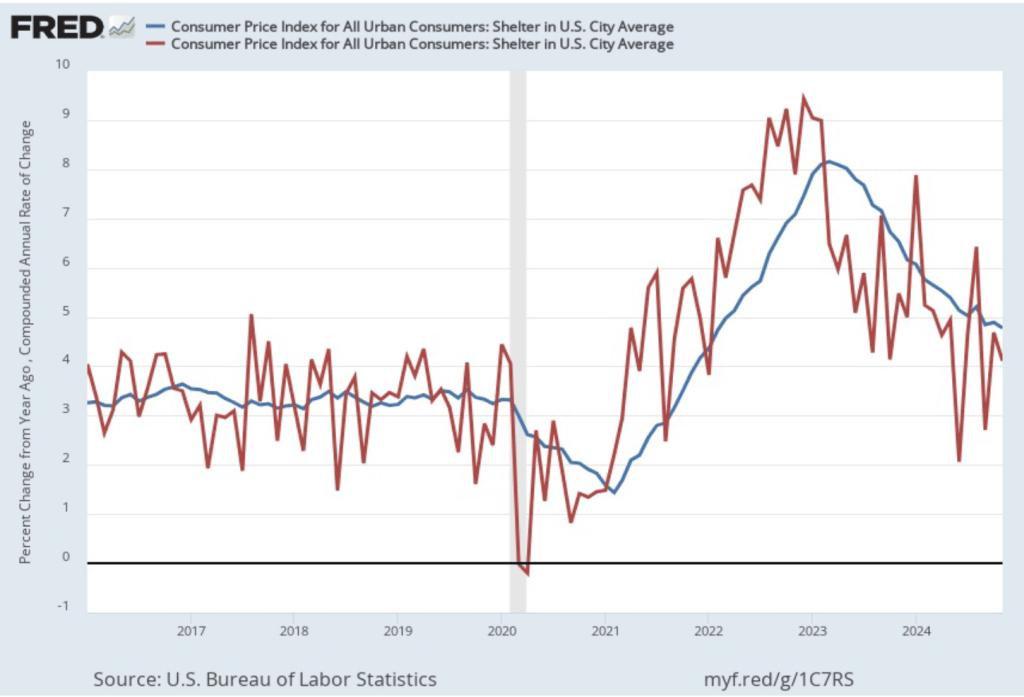 As the following figure shows, inflation in the price of shelter has been a significant contributor to headline inflation. The blue line shows 12-month inflation in shelter, and the red line shows 1-month inflation in shelter. Twelve-month inflation in shelter has been declining since the spring of 2023, but in November it was at a still high 4.8 percent. One-month inflation in shelter—which is much more volatile than 12-month inflation in shelter—fell from 4.7 percent in October to 4.1 percent in November.