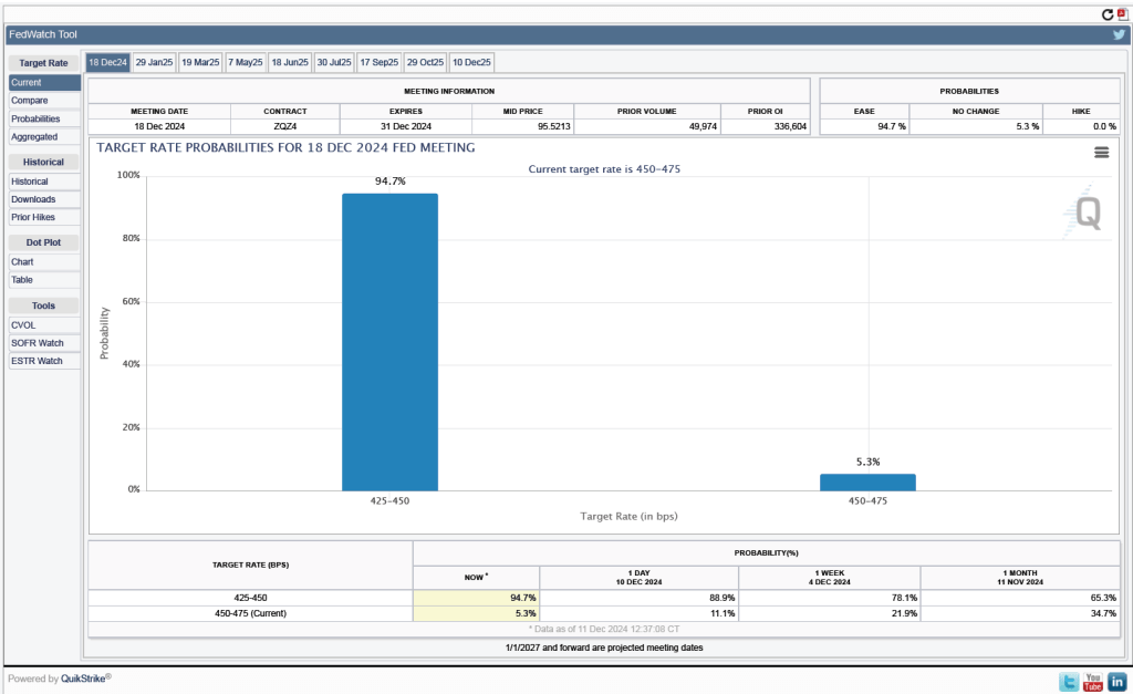 Will this persistence in inflation above the Fed’s 2 percent target cause the FOMC to hold constant its target range for the federal funds rate? Investors who buy and sell federal funds futures contracts still expect that the FOMC will cut its target for the federal funds rate by 0.25 percentage point at its next meeting on December 17-18. (We discuss the futures market for federal funds in this blog post.) The following figure shows that today these investors assign a probability of 94.7 percent to the FOMC cutting its target for the federal funds rate by 0.25 percentage point and a probability of only 5.3 percent to the committee leaving its target unchanged at its current range of 4.50 percent to 4.75 percent.