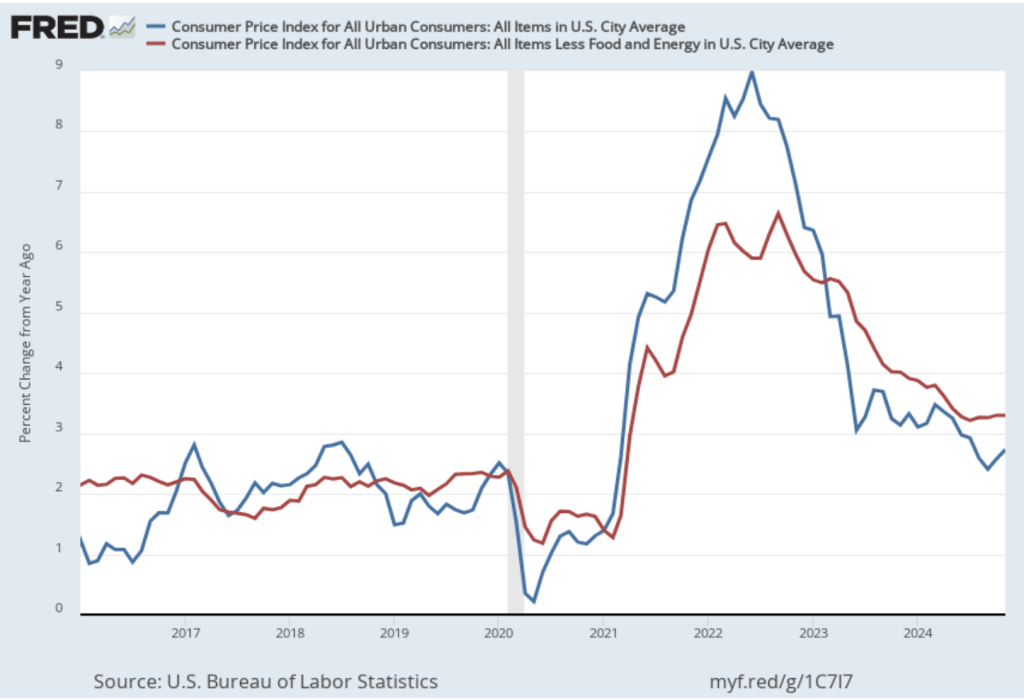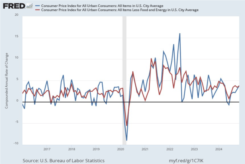 On December 11, the Bureau of Labor Statistics (BLS) released its monthly report on the consumer price index (CPI). The following figure compares headline inflation (the blue line) and core inflation (the red line).