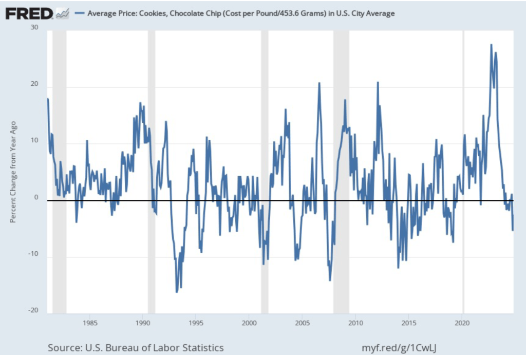 Because inflation in chocolate chip cookie prices ended, or course! In December 2023, the average retail price of a pound of chocolate chip cookies (even we try not to eat a pound of cookies in one sitting!) was $5.12. In November 2024, the price had declined to $4.92 per pound. As the following figure shows, the days of 20 percent annual inflation in chocolate chip cookie inflation that lasted from September 2022 to April 2023 are behind us—at least for now.