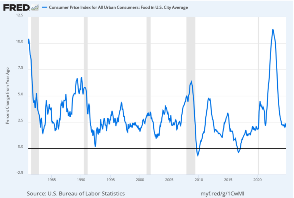 The following figure shows annual inflation in overall food prices as measured by the percentage change in the food component of the consumer price index (CPI) from the same month in the previous year. During 2024, food inflation has been running at an annual rate of between 2.0 percent and 2.5 percent. In contrast, chocolate chip cookies actually experienced deflation of –1.1 percent. So, the price of chocolate chip cookies relative to the prices of other food products declined by more than did the absolute price.