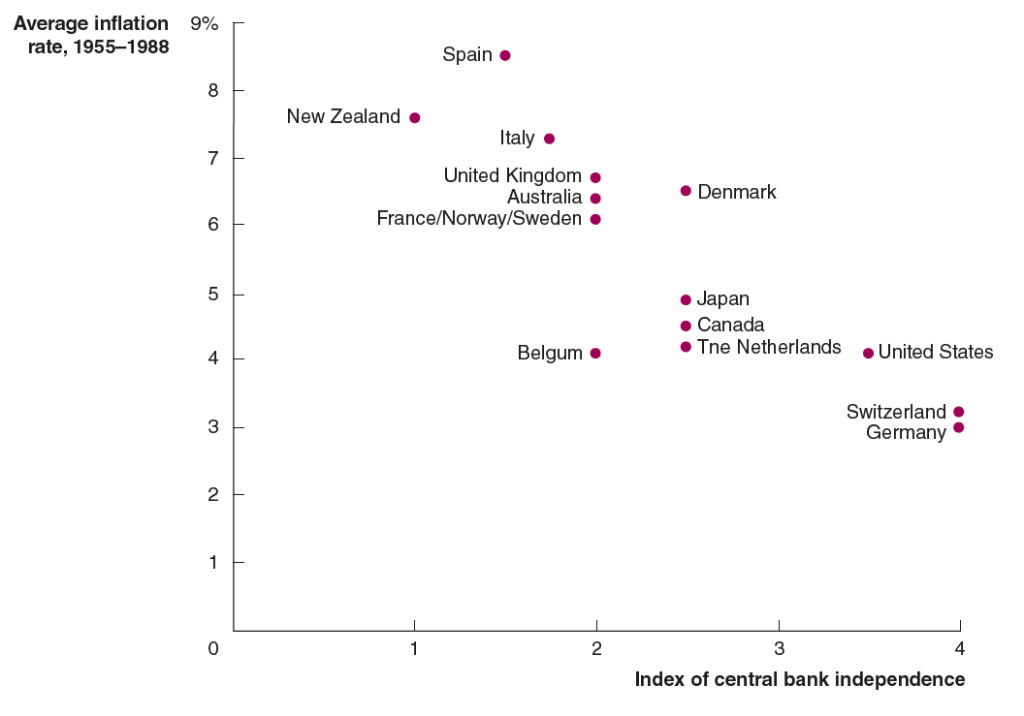 As we discuss in Macroeconomics, Chapter 17, Section 17.4 (Economics, Chapter 27, Section 27.4), in a classic study, Alberto Alesina and Lawrence Summers compared the degree of central bank independence and the inflation rate for 16 high-income countries during the years from 1955 to 1988. As the following figure shows, countries with highly independent central banks, such as the United States, Switzerland, and Germany, had lower inflation rates than countries whose central banks had little independence, such as New Zealand, Italy, and Spain.