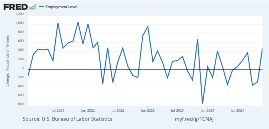 As the following figure shows, the net change in jobs from the household survey moves much more erratically than does the net change in jobs from the establishment survey. The net change in jobs as measured by the household survey for December also showed a strong increase of 478,000 jobs following a decline of 273,000 jobs in November. In any particular month, the story told by the two surveys can be inconsistent with employment increasing in one survey while falling in the other. But in December the two surveys were sending the same signal of rapid employment growth. (In this blog post, we discuss the differences between the employment estimates in the household survey and the employment estimates in the establishment survey.)