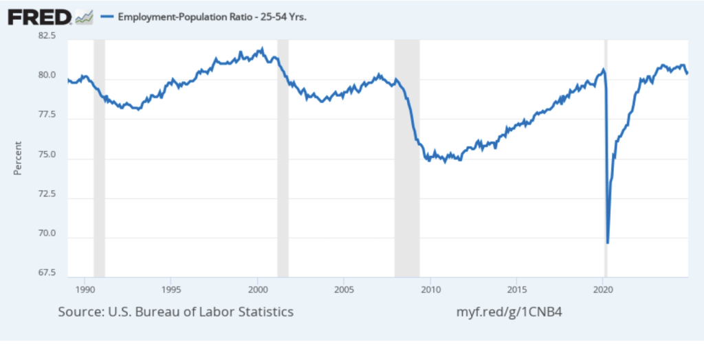 The employment-population ratio for prime age workers—those aged 25 to 54—also increased, as shown in the following figure, to 80.5 percent in December from 80.4 percent in November. Although the employment-population is below its recent high of 80.9 percent, it remains high relative to levels seen since 2001.