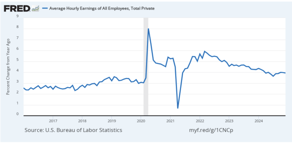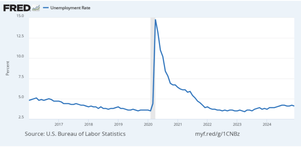 Last September the Federal Reserve’s policymaking Federal Open Market Committee (FOMC) cut its target for the federal funds rate by 0.50 percentage point (50 basis points. Many economists and policymakers expected the FOMC to continue cutting its federal funds rate target at meetings through 2025. (We discussed the September target cut in this blog post.) The FOMC cut its target by 25 basis points at both its November and December 2024 meetings. But by the December meeting, it had become clear that the inflation rate was not falling as quickly to the Fed’s 2 percent target as the committee members had hoped. As FOMC’s staff economists put it, there had been “upward surprises” in inflation data. According to the minutes of the December meeting, several members of the committee believed that “upside risks to the inflation outlook had increased.”