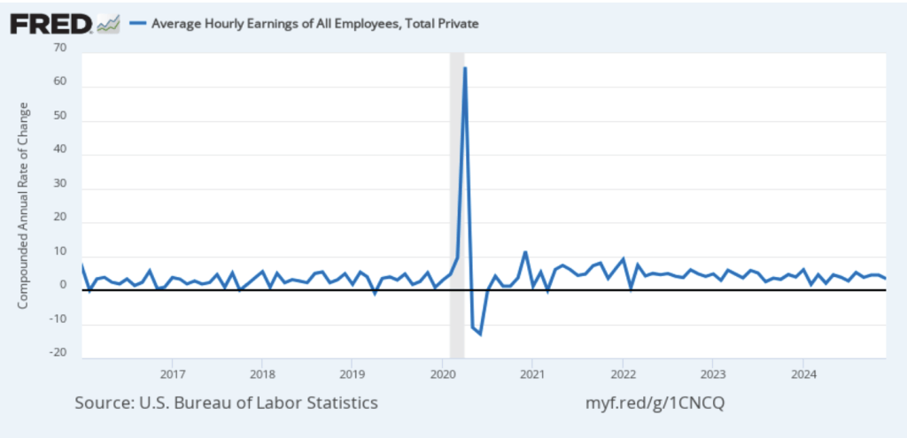 The following figure shows wage inflation calculated by compounding the current month’s rate over an entire year. (The figure above shows what is sometimes called 12-month wage inflation, whereas this figure shows 1-month wage inflation.) One-month wage inflation is much more volatile than 12-month wage inflation—note the very large swings in 1-month wage inflation in April and May 2020 during the business closures caused by the Covid pandemic. The December 1-month rate of wage inflation was 3.4 percent, a decline from the 4.9 percent rate in November. Whether measured as a 12-month increase or as a 1-month increase, AHE is still increasing somewhat more rapidly than is consistent with the Fed achieving its 2 percent target rate of price inflation.