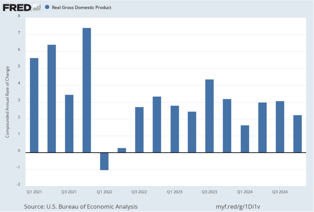 Today (January 30), the Bureau of Economic Analysis (BEA) released its advance estimate of GDP for the fourth quarter of 2024. (The report can be found here.) The BEA estimates that real GDP increased at an annual rate of 2.3 percent in the fourth quarter—October through December. That was down from the 3.1 percent increase in real GDP in the third quarter. On an annual basis, real GDP grew by 2.5 percent in 2024, down from 3.2 percent in 2023. A 2.5 percent growth rate is still well above the Fed’s estimated long-run annual growth rate in real GDP of 1.8 percent. The following figure shows the growth rate of real GDP (calculated as a compound annual rate of change) in each quarter since the first quarter of 2021.