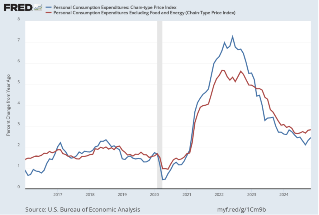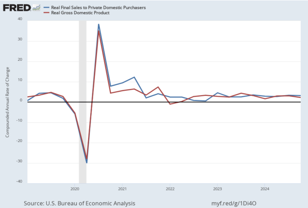 The following figure shows growth in real GDP (the blue line) and in real final sales to private domestic purchasers (the red line) with growth measured as compound annual rates of change. Measured this way, in the fourth quarter of 2024, real final sales to private domestic producers increased by 3.2 percent, well above the 2.3 percent increase in real GDP. Growth in real final sales to private domestic producers was down from 3.4 percent in the third quarter, while growth in real GDP was down from 3.1 percent in third quarter. Overall, using Powell’s preferred measure, growth in production seems strong.