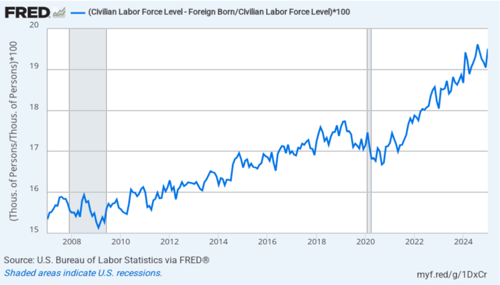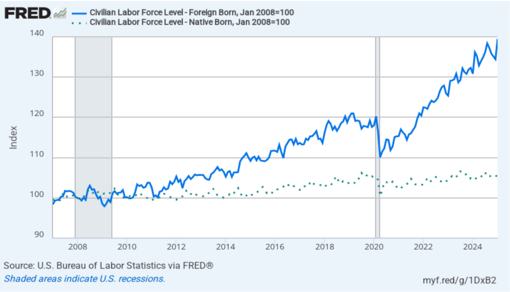 The following figure shows the more rapid growth of foreign-born workers in recent years in comparison with the growth in native-born workers. In the figure, we set the number of native-born workers and the number of foreign-born workers both equal to 100 in January 2007. Between January 2007 and January 2025, the number of foreign-born workers increased by 40 percent, while the number of native-born workers increased by only 6 percent.