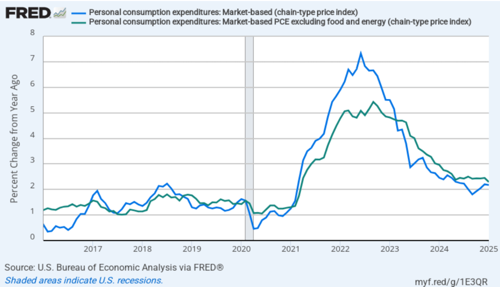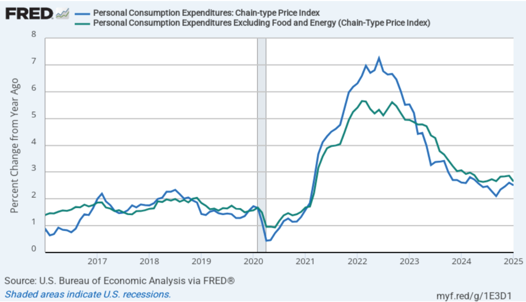 Today (February 28), the BEA released monthly data on the personal consumption expenditures (PCE) price index as part of its “Personal Income and Outlays” report. The Fed relies on annual changes in the PCE price index to evaluate whether it’s meeting its 2 percent annual inflation target. The following figure shows PCE inflation (blue line) and core PCE inflation (green line)—which excludes energy and food prices—for the period since January 2016 with inflation measured as the percentage change in the PCE from the same month in the previous year. Measured this way, in January PCE inflation was 2.5 percent, down slightly from 2.6 in December. Core PCE inflation in January was 2.6 percent, down from 2.9 percent in December. Headline and core PCE inflation were both consistent with the forecasts of economists.