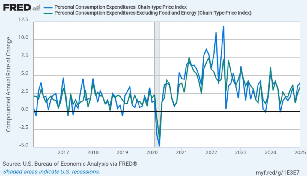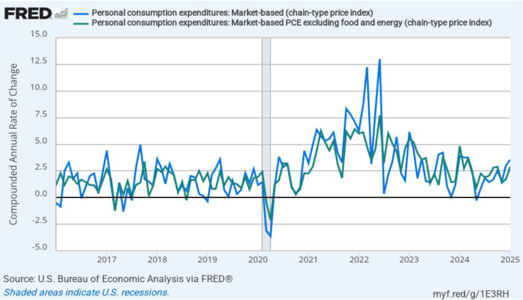 As shown the following figure shows, investors assign a probability of greater than 50 percent that the FOMC will cut its target range by at least 25 basis points at its meeting nearly four months from now on June 17–18. Investors may be concerned that the economy is showing some signs of weakening. Today’s BEA report indicates that real personal consumption expenditures declined at a very high 5.5 percent compound annual rate in January. (Although measured as the 12-month change, real consumption spending increased by 3.o percent in January.)
