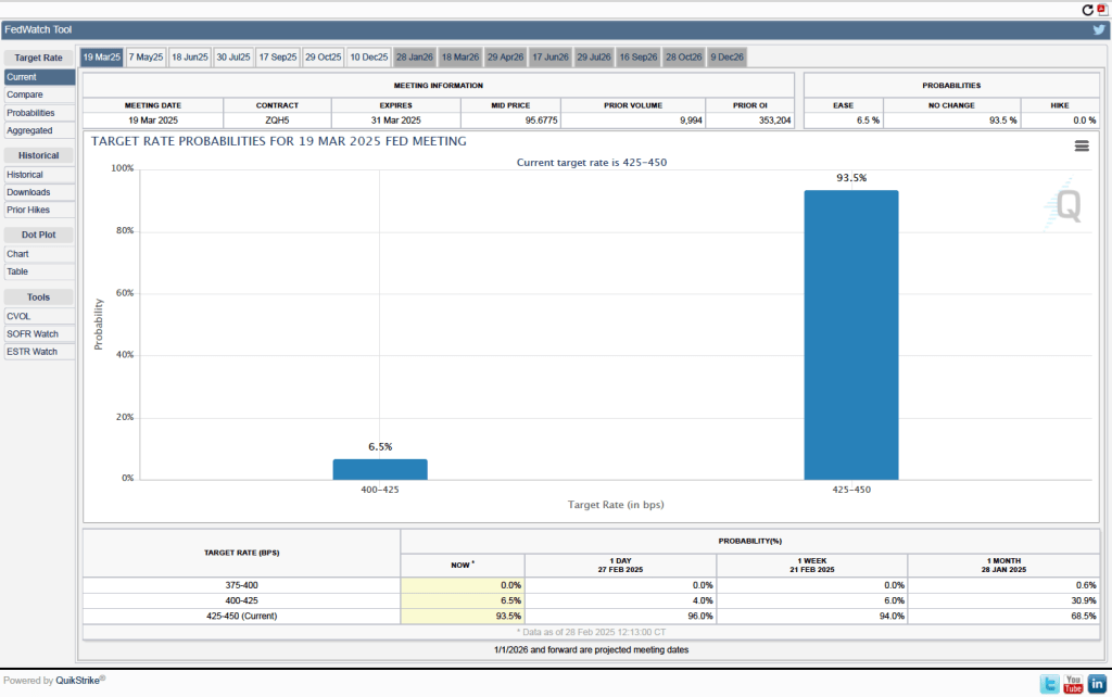 Investors who buy and sell federal funds futures contracts expect that the FOMC will leave its federal funds rate target unchanged at its next meeting. (We discuss the futures market for federal funds in this blog post.) As the following figure shows, investors assign a probability of 93.5 percent to the FOMC leaving its target for the federal funds rate unchanged at the current range of 4.25 percent to 4.50. Investors assign a probability of only 6.5 percent to the FOMC cutting its target by 0.25 percentage point (25 basis points).