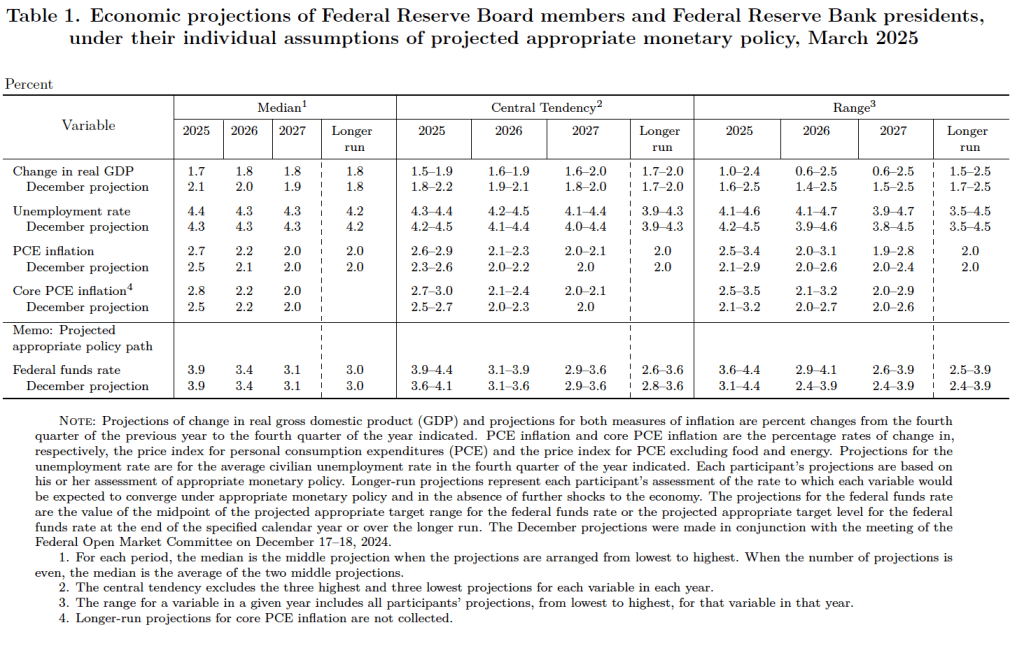 - Committee members reduced their forecast of real GDP growth for 2025 from 2.1 percent in December to 1.7 percent today. Committee members also slightly increased their forecast of the unemployment rate at the end of 2025 from 4.3 percent to 4.4 percent. (The unemployment rate in February was 4.1 percent.)