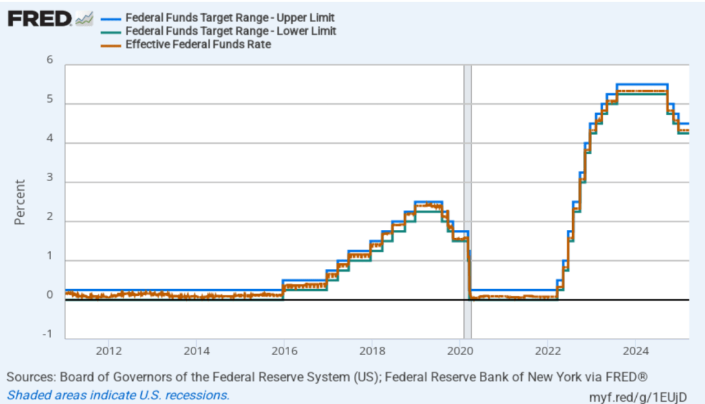 - The committee’s forecast of the federal funds rate at the end of 2025 was unchanged at 3.9 percent. The federal funds rate today is 4.33 percent, which indicates that committee members expect to make two 0.25 percentage point (25 basis points) cuts in their target for the federal funds rate this year. Investors are similarly forecasting two 25 basis point cuts.