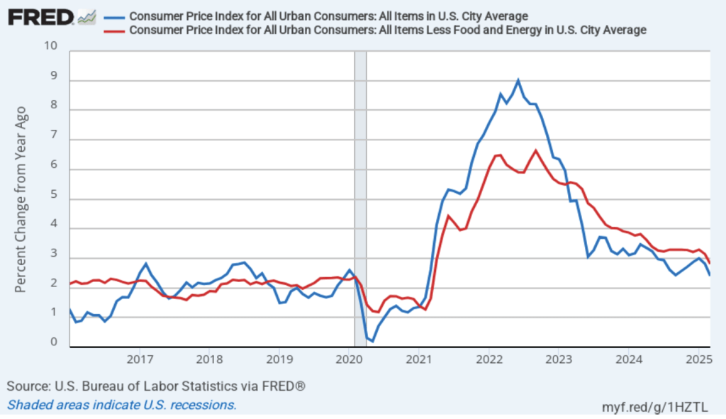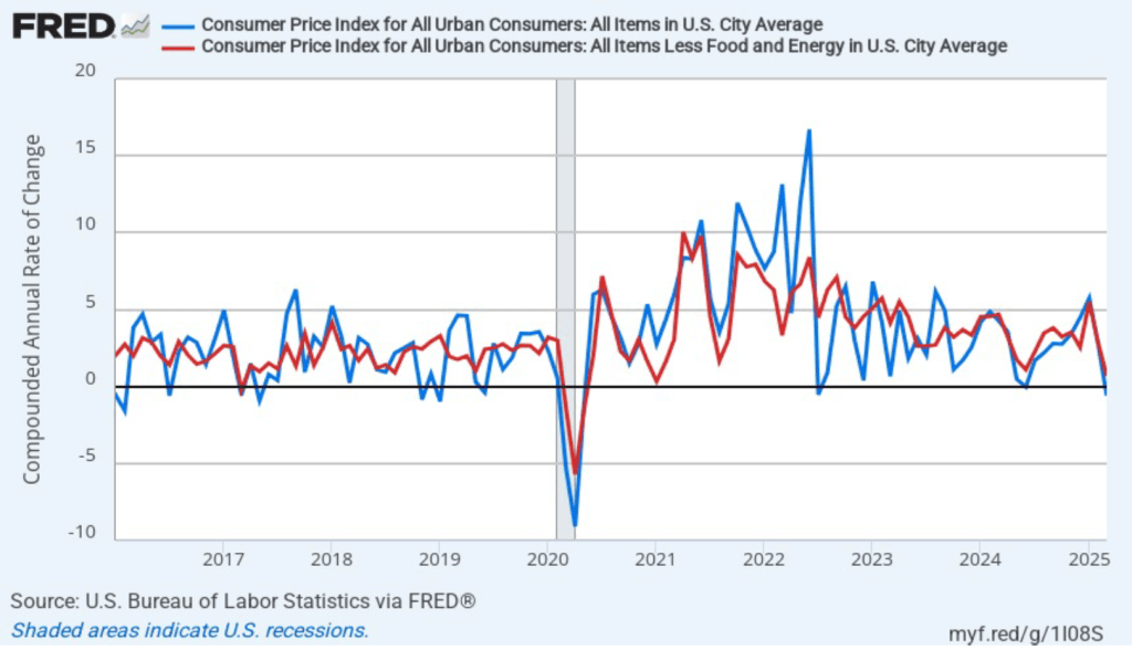 Today (April 10), the Bureau of Labor Statistics (BLS) released its monthly report on the consumer price index (CPI). The following figure compares headline inflation (the blue line) and core inflation (the red line).
