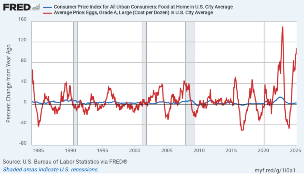 There’s been considerable discussion in the media about continuing inflation in grocery prices. In the following figure the blue line shows inflation in the CPI category “food at home,” which is primarily grocery prices. Inflation in grocery prices was 2.4 percent in March, up from 1.8 percent in February, but still far below the peak of 13.6 percen in August 2022. Although, on average, grocery price inflation has been low over the past 18 months, there have been substantial increases in the prices of some food items. For instance, egg prices—shown by the red line—increased by 108.1 percent in March. But, as the figure shows, egg prices are usually quite volatile month-to-month, even when the country is not dealing with an epidemic of bird flu.
