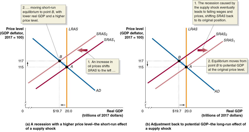 Although the figure shows the effects of an aggregate supply shock that results from an unexpected increase in oil prices, using this model, the result is the same for an aggregate supply shock caused by an unexpected increase in tariffs. Two-thirds of U.S. imports are raw materials, intermediate goods, or capital goods, all of which are used as inputs by U.S. firms. So, in both the case of an increase in oil prices and in the case of an increase in tariffs, the result of the supply shock is an increase in U.S. firms’ production costs. This increase in costs reduces the quantity of goods firms will supply at every price level, shifting the SRAS curve to the left, as shown in panel (a) of the figure. In the new macroeconomic equilibrium, point B in panel (a), the price level increases and the level of real GDP declines. The decline in real GDP will likely result in an increase in the unemployment rate.