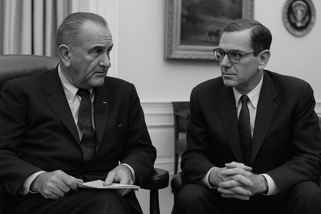 An image generated by ChatGTP-4o of a hypothetical meeting between President Lyndon Johnson and Fed Chair William McChesney Martin in the White House.