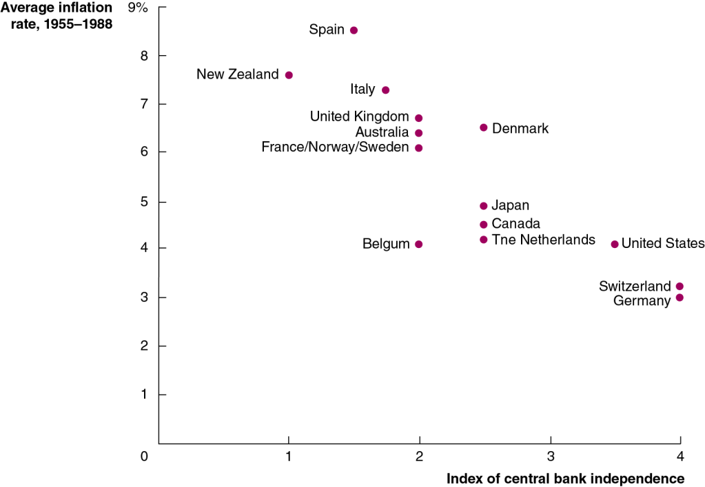 The figure is from a classic study by Alberto Alesina and Lawrence Summers, who were both economists at Harvard University at the time. Alesina and Summers tested the assertion that the less independent a country’s central bank, the higher the country’s inflation rate will be by comparing the degree of central bank independence and the inflation rate for 16 high-income countries during the years from 1955 to 1988. As the figure shows, countries with highly independent central banks, such as the United States, Switzerland, and Germany, had lower inflation rates than countries whose central banks had little independence, such as New Zealand, Italy, and Spain. In the following years, New Zealand and Canada granted their banks more independence, at least partly to better fight inflation.