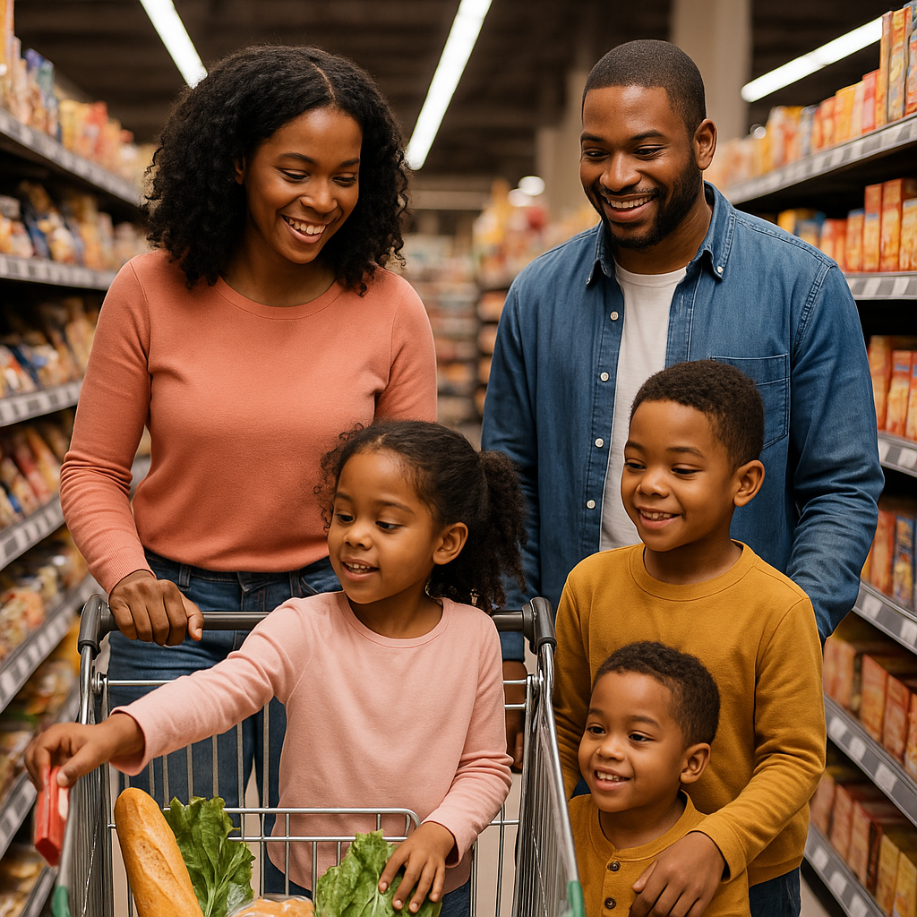 Image generated by ChatGTP-4o of a family shopping in a supermarket.