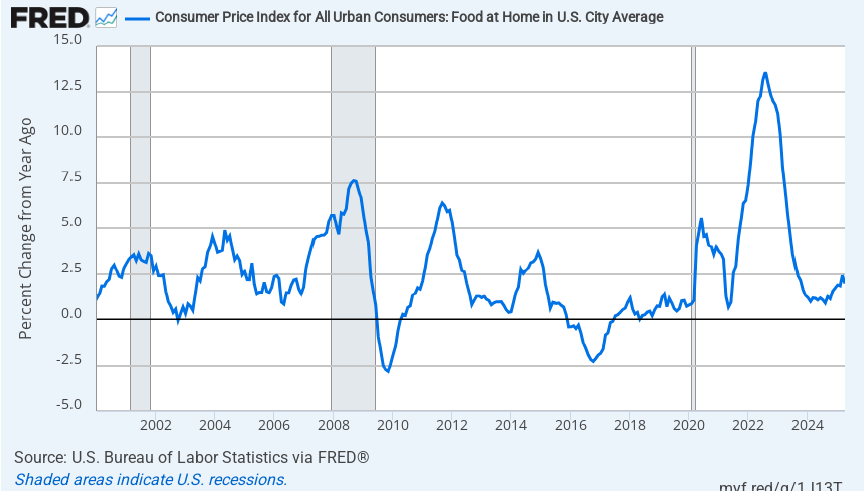 There’s been considerable discussion in the media about continuing inflation in grocery prices. The following figure shows inflation in the CPI category “food at home,” which is primarily grocery prices. Inflation in grocery prices was 2.0 percent in April and has been below 2.5 percent every month since September 2023. Over the past year, there has been a slight upward trend in inflation in grocery prices but to this point it remains relatively low, although well above the very low rates of inflation in grocery prices that prevailed from 2015 to 2019.