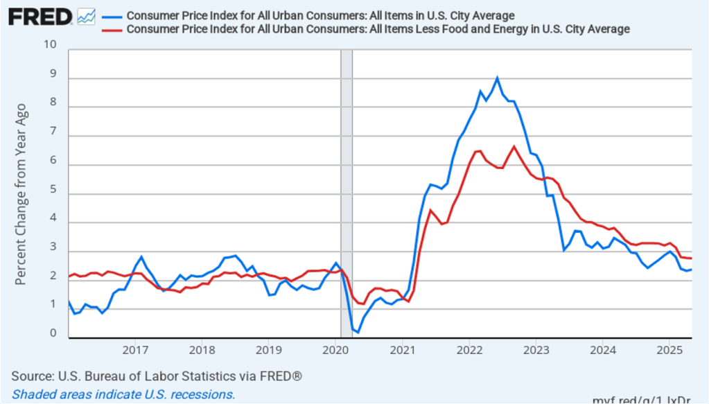 Today (June 11), the Bureau of Labor Statistics (BLS) released its report on the consumer price index (CPI) for May. The following figure compares headline CPI inflation (the blue line) and core CPI inflation (the green line).