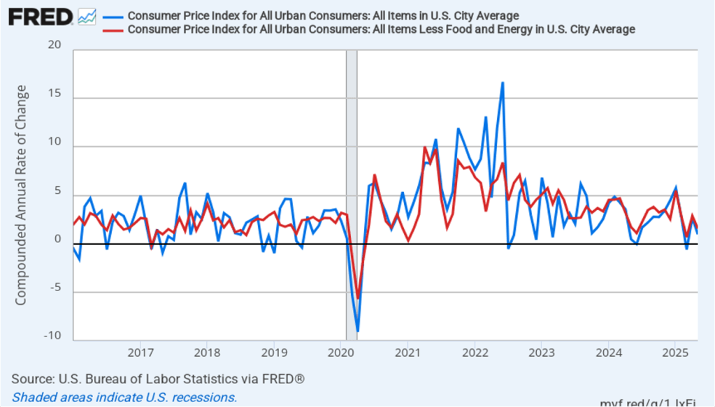 The 1-month and 12-month inflation rates are telling different stories, with 12-month inflation indicating that the rate of price increase is running slightly above the Fed’s 2 percent inflation target. The 1-month inflation rate indicates a significant slowing of inflation during May.