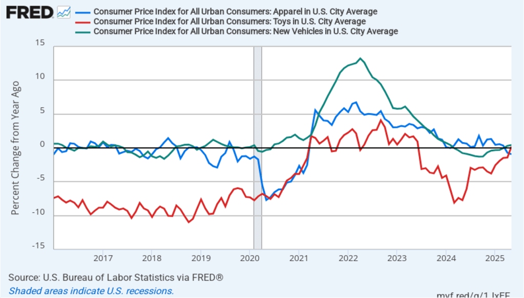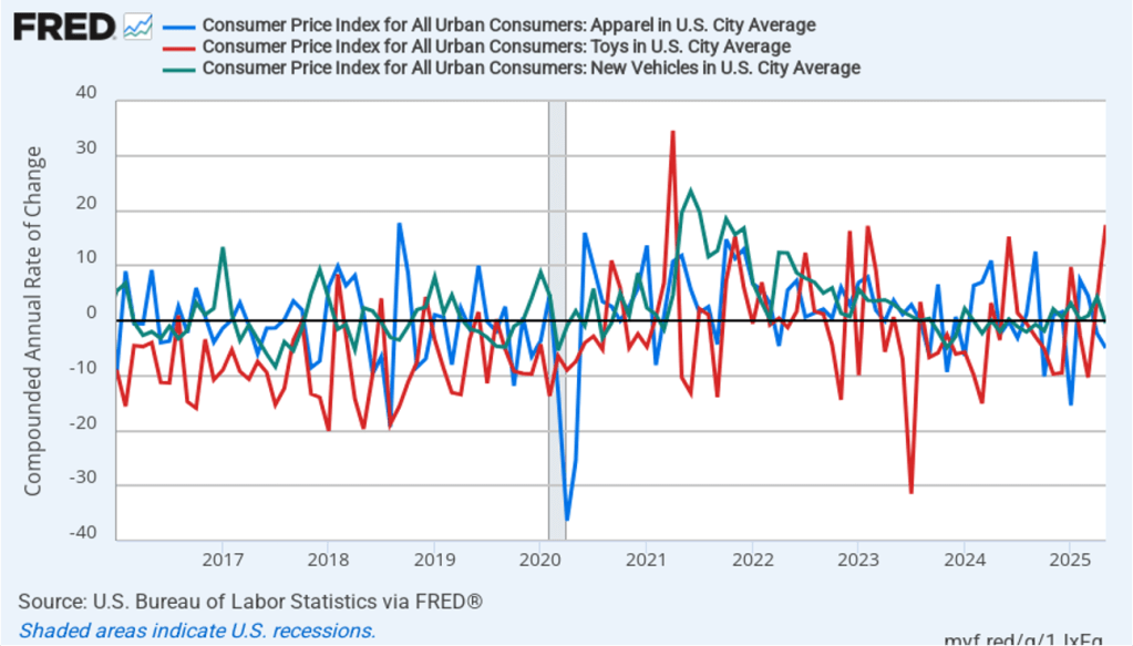 One of the key questions facing Federal Reserve policymakers is to what extent inflation will be affected by the increase in tariffs that the Trump administration announced on April 2. The following figure shows 12-month inflation in three categories of products whose prices are thought to be particularly vulnerable to the effects of tariffs: apparel (the blue line), toys (the red line), and motor vehicles (the green line). In May, prices of apparel fell, while the prices of toys and motor vehicles rose by less than 0.5 percent.